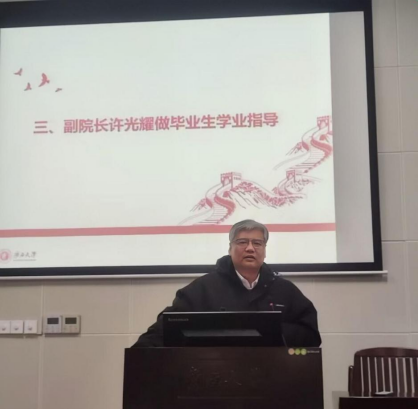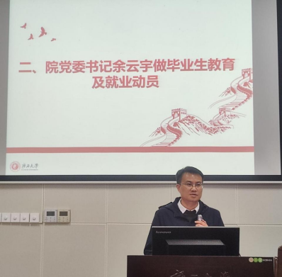 会议伊始,党委副书记邓惠英结合往届生就业情况及去向、当前就业形势对毕业生开展动员,鼓励毕业生合理规划,积极把握工作机会。党委书记余云宇从理想信念、意志品质、底线纪律、爱校荣校等方面对本研毕业生进行了主题教育及就业动员。副院长许光耀分享学习和生活方面的经验,就毕业论文写作进行详细指导,团委书记申孟鑫对就业签约的注意事项以及毕业相关事项的办理进行介绍和说明。