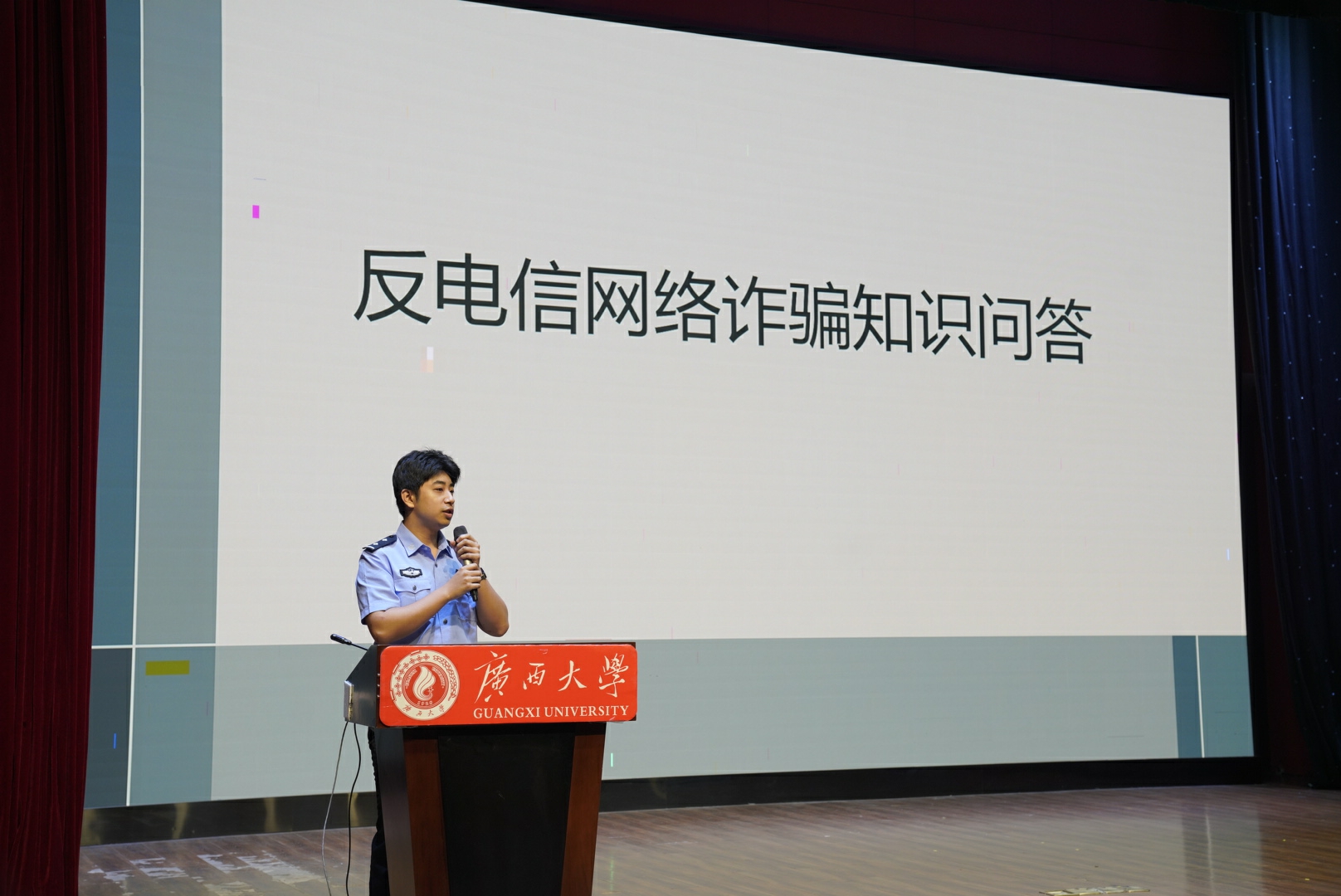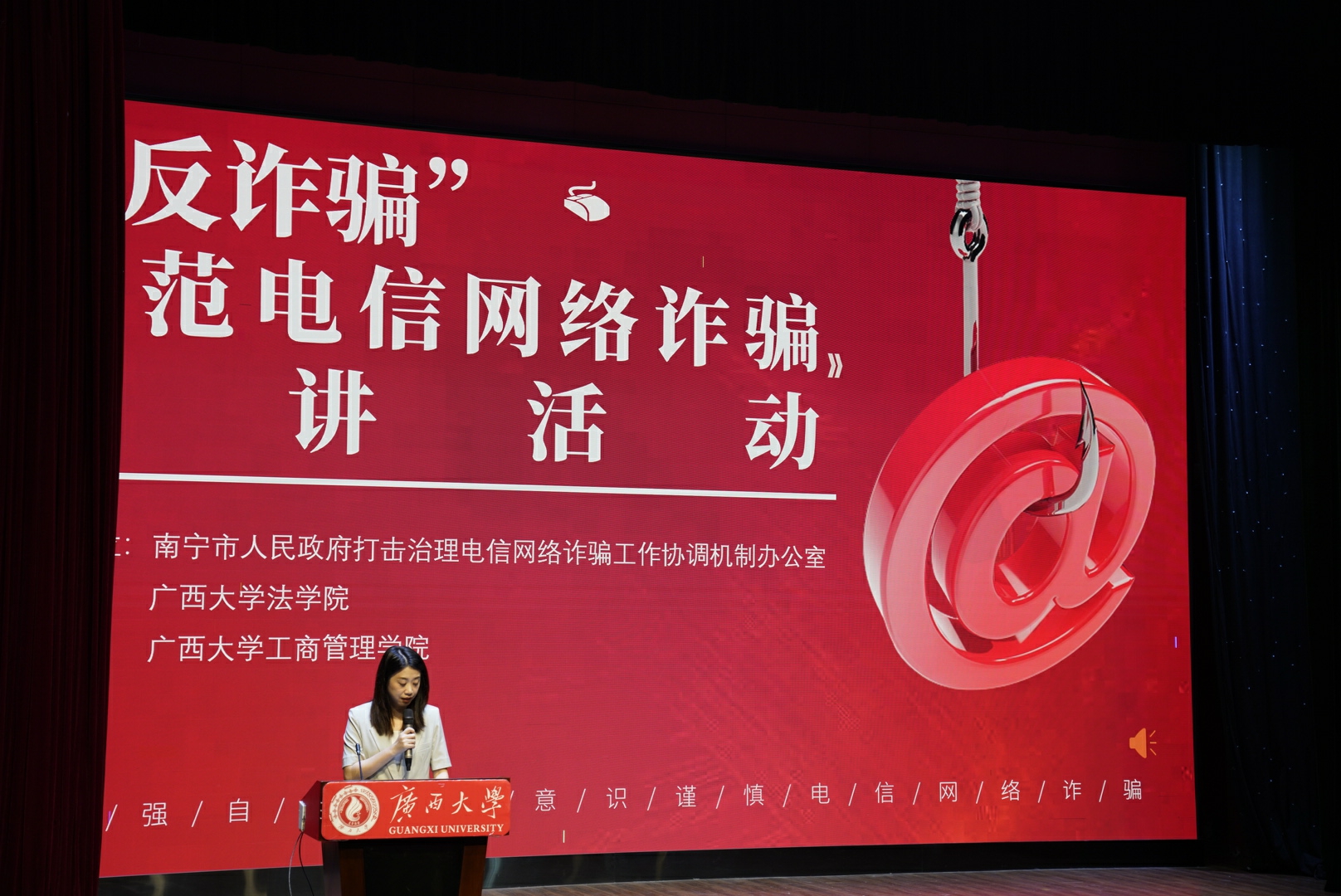 随后,南宁市公安局西乡塘分局网侦大队四级警长陆莉娜开展反诈知识主题宣讲。她结合辖区内高校高发频发的真实案例,以通俗易懂的语言,深入拆解境内外各类电信网络诈骗的作案套路,重点剖析刷单返利、冒充客服退款、冒充公检法等针对师生群体的典型诈骗形式,详细讲解对应的防范技巧、应对措施及合法维权途径。
