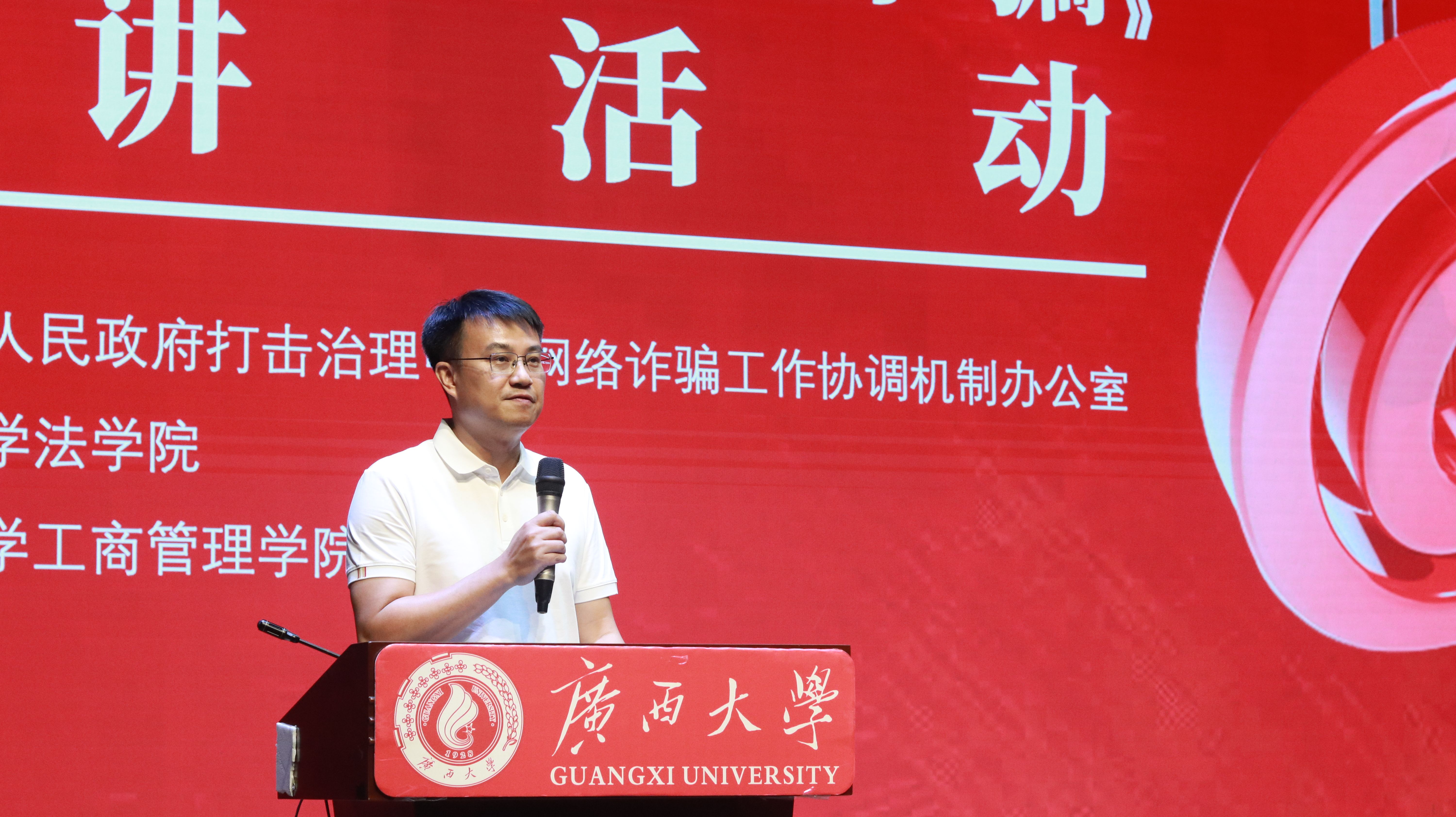 为进一步强化校园反诈宣传教育实效,切实提升广大师生防范电信网络诈骗的意识和能力,有效守护师生财产安全,4月14日下午,由南宁市人民政府打击治理电信网络诈骗工作协调机制办公室、伟德国际victor1946、伟德国际victor1946工商管理学院联合主办的防范电信网络诈骗宣讲活动,在伟德国际victor1946大学生活动中心小剧场成功举办。伟德国际victor1946党委书记余云宇,工商管理学院党委副书记、纪委书记肖克宁,保卫处副处长陈宏,以及南宁市公安局网侦支队预警反制大队大队长谭伟、副大队长黎彦辰出席活动,活动由伟德国际victor1946党委委员、副院长刘馨元主持。伟德国际victor1946、工商管理学院师生代表参加活动,互动交流积极,宣讲活动取得了良好的宣传教育效果。