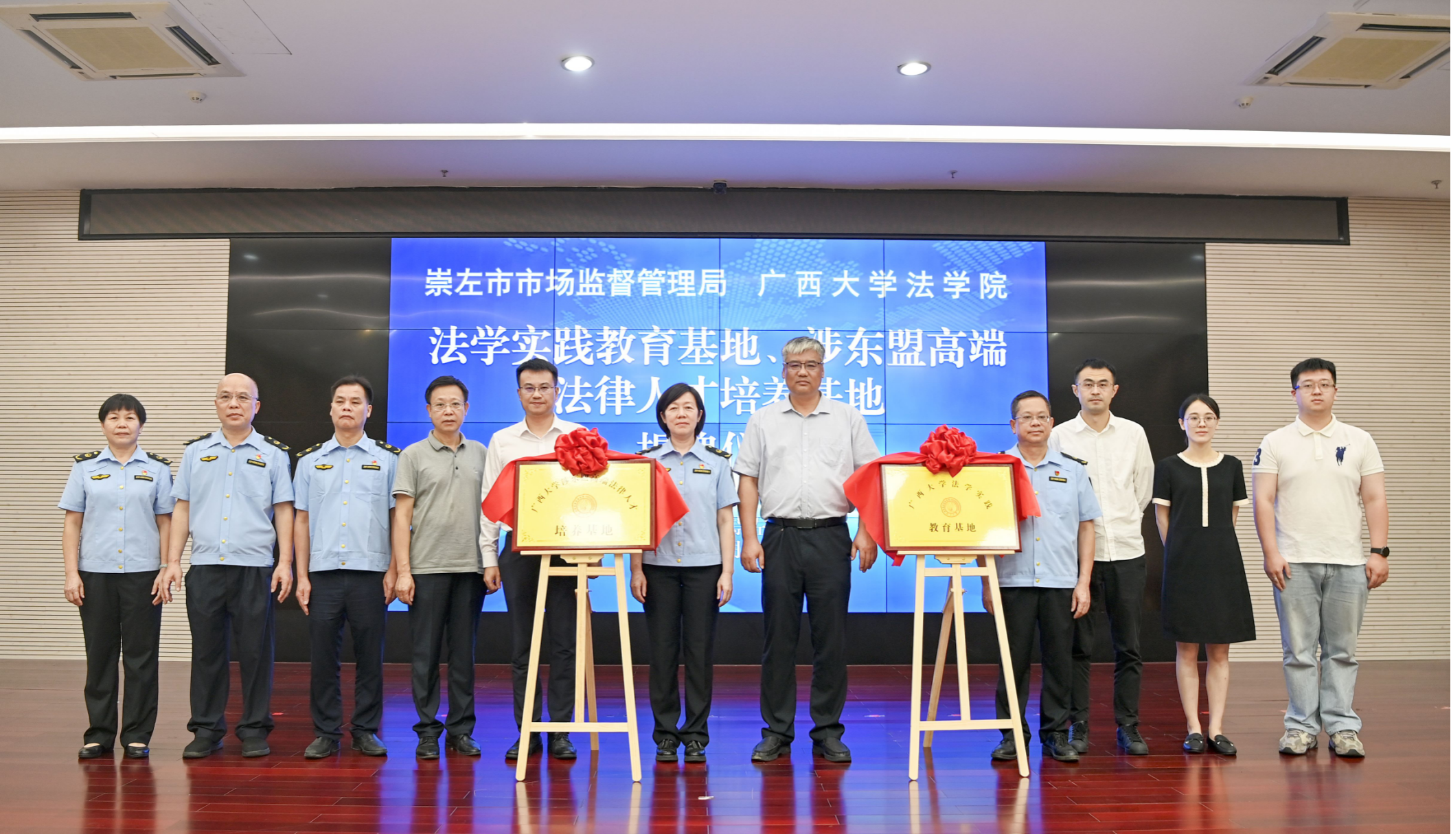 Chongzuo City Market Supervision Administration, the Bureau of Justice and Law school leaders jointly unveiled the plaque for the base, in the talks, the parties around the content of the agreement, to explore how to give full play to their respective strengths, in the foreign rule of law theory and practice research, foreign rule of law personnel training and other areas to promote in-depth cooperation.