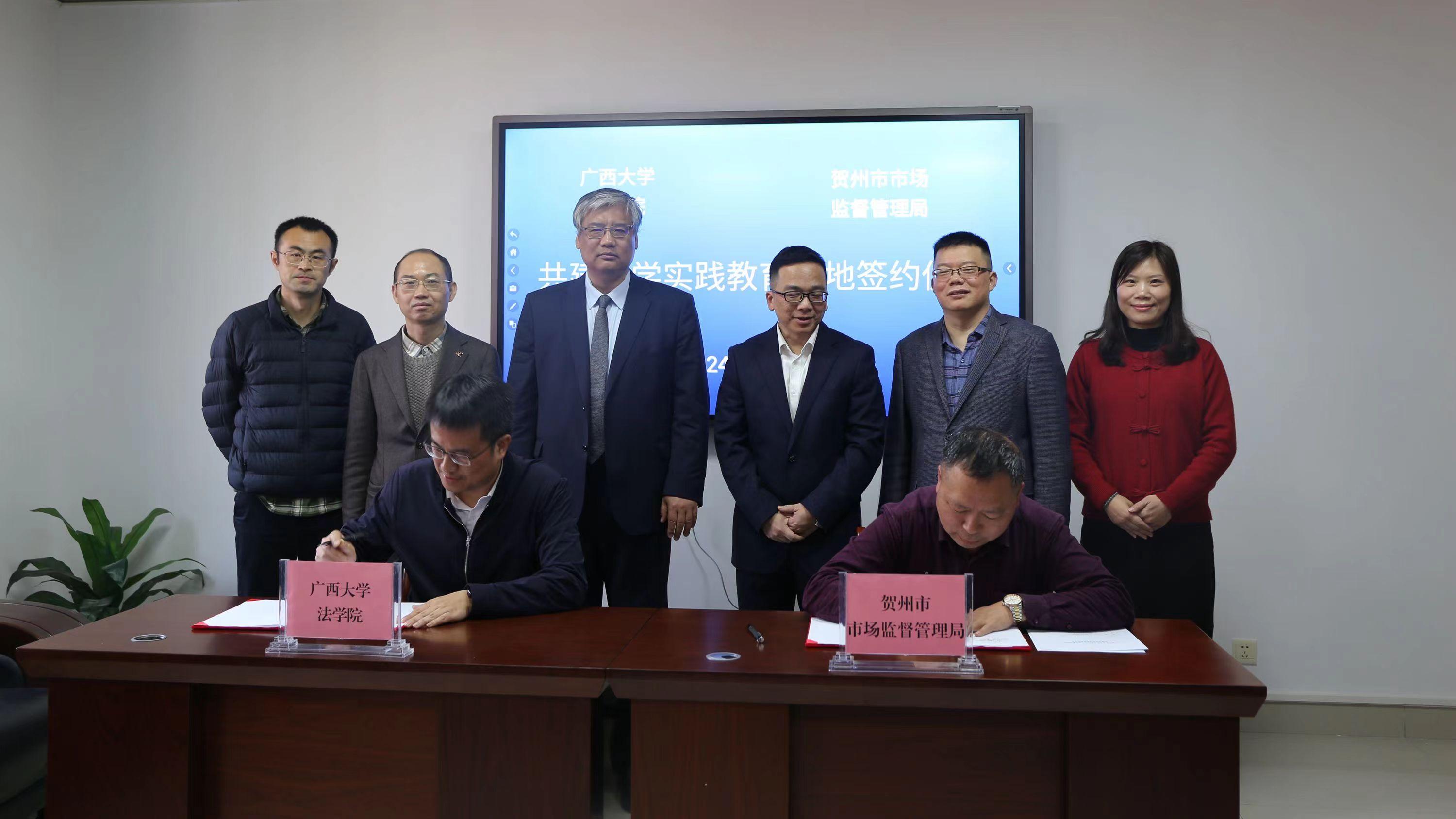 3月5日,我院与贺州市市场监管局共建“法学实践教育基地”签约仪式暨交流座谈会在贺州举行。院领导余云宇、许光耀与贺州市场监管局主要负责人共同签订了共建基地协议,并为“法学实践教育基地”揭牌。这是我院首次与市场监管实务部门共建实践教育基地。