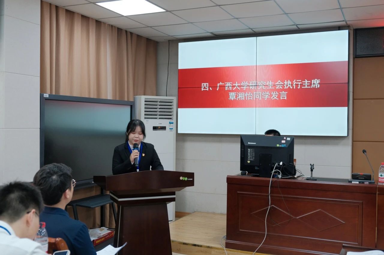 伟德国际victor1946党委副书记韦兴剑致辞。她高度肯定了过去一年伟德国际victor1946第二十九届研究生会在思想引领、科研学习、实践服务、权益维护等方面所做的工作,并对伟德国际victor1946新一届研究生会成员和研究生同学提出三点建议:一是研究生会要强化思想引领,持续深化改革,坚持党的领导,全心全意为同学服务。二是研究生会成员要保持清澈纯粹,牢记服务的宗旨,去除功利化、庸俗化的思想,多为同学计,少为自己谋。三是研究生要自觉锤炼本领,勇攀科研的高峰,恪守学生本分,培养科学精神,在推动边疆民族地区高质量发展上展现出更大的作为。她表示,希望同学们继续发扬伟德国际victor1946研究生会的优良传统,带领同学们德法兼修,在青春的赛道上奋力奔跑,跑出当代青年最好的成绩。
