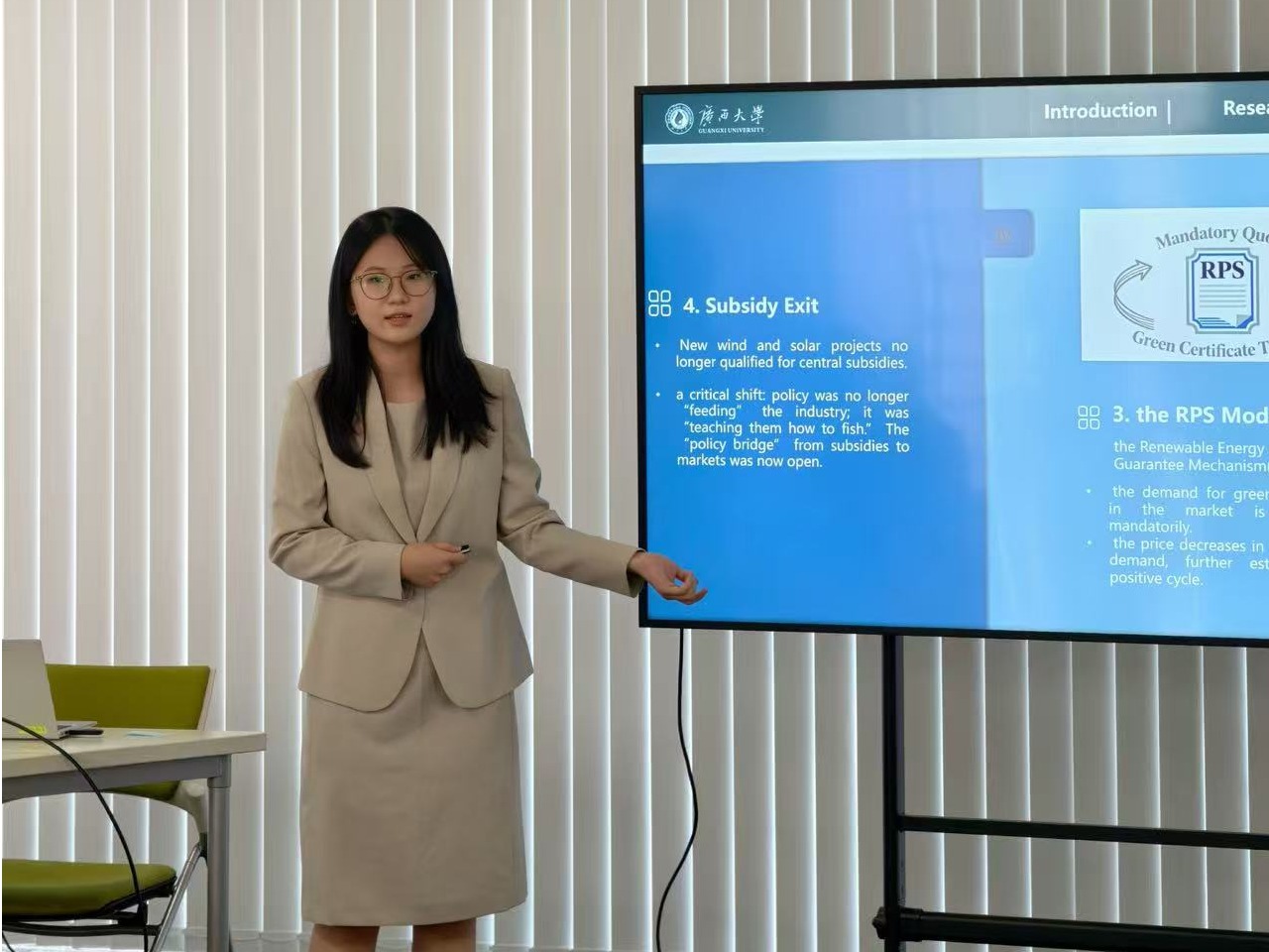 刘文慧同学以“Subsidies, GEC and Green Electricity:the Evolution of China's Clean Electricity Transaction Mechanisms(2006-2025)”为题进行汇报,内容涵盖中国能源转型激励措施的三段模型“补贴-绿证交易-绿电交易”等,并与日本学者就中国的转型方式在国际上转化可能性的方面进行深入的交流与讨论,充分体现我校学子在国际深度上的思考与深刻理解。