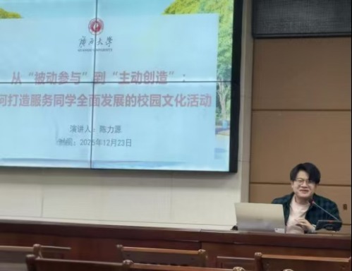 随后,陈力源老师以“从‘被动参与’到‘主动创造’:打造服务同学全面发展的校园文化活动”为题分享经验。他结合自身组织活动的丰富经验,以伟德国际victor1946研究生会“姻为遇见”研究生交流会为典型案例,阐述了如何通过活动激发学生主动性,实现从“被动接受”到“深度参与”的转变。