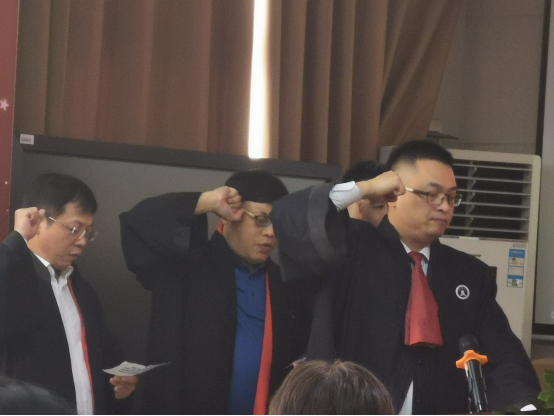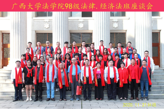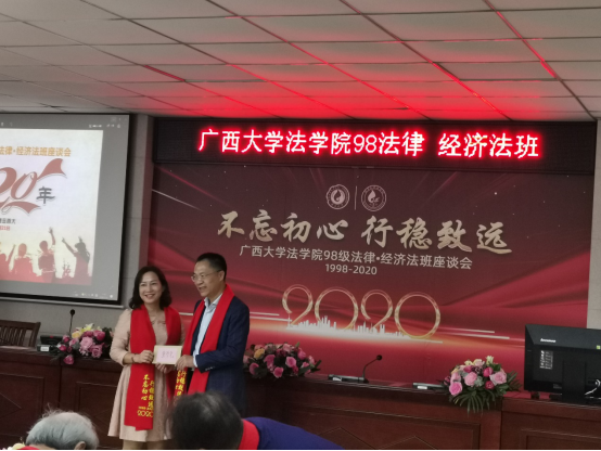 肖丽玲老师、黄俊阳老师以及校友代表冯英艳、蒙林强、玉荣嘉、唐忠兴等先后发言。座谈会上,由玉荣嘉校友担任领誓,手抚宪法,带领三名律师校友身着律师袍面向国旗,并在黄建荣书记的监誓下重温了律师执业誓词。