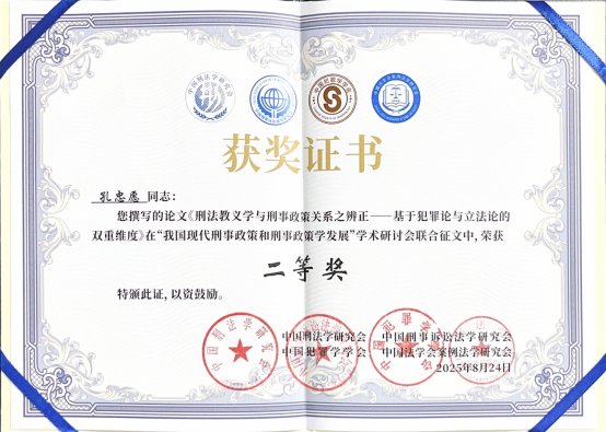 我院助理教授孔忠愿撰写的论文《刑法教义学与刑事政策关系之辨正——基于犯罪论与立法论的双重维度》,在“我国现代刑事政策和刑事政策学发展”学术研讨会联合征文中,荣获二等奖。