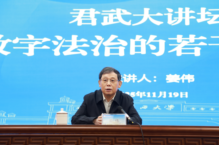 11月19日,最高人民法院咨询委员会副主任委员、中国法学会网络与信息法学研究会会长姜伟教授应邀莅临我校,以“数字法治的若干问题”为题为师生作君武大讲坛学术报告。